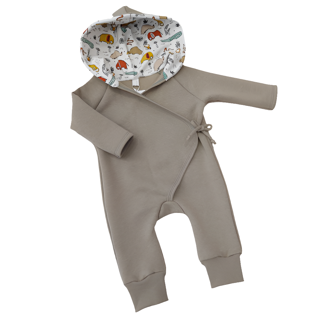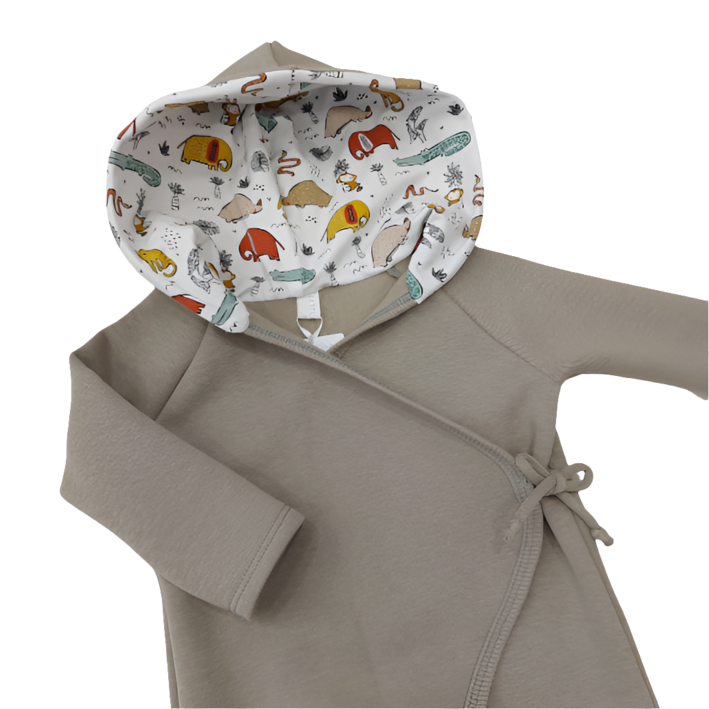 Ολόσωμο βρεφικό φορμάκι με κουκούλα και κρουαζέ άνοιγμα εμπρός.