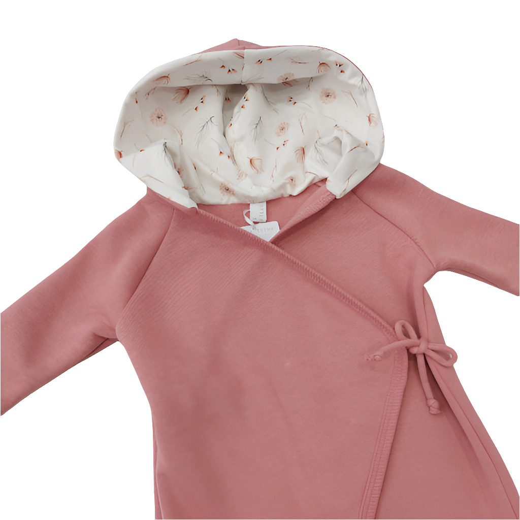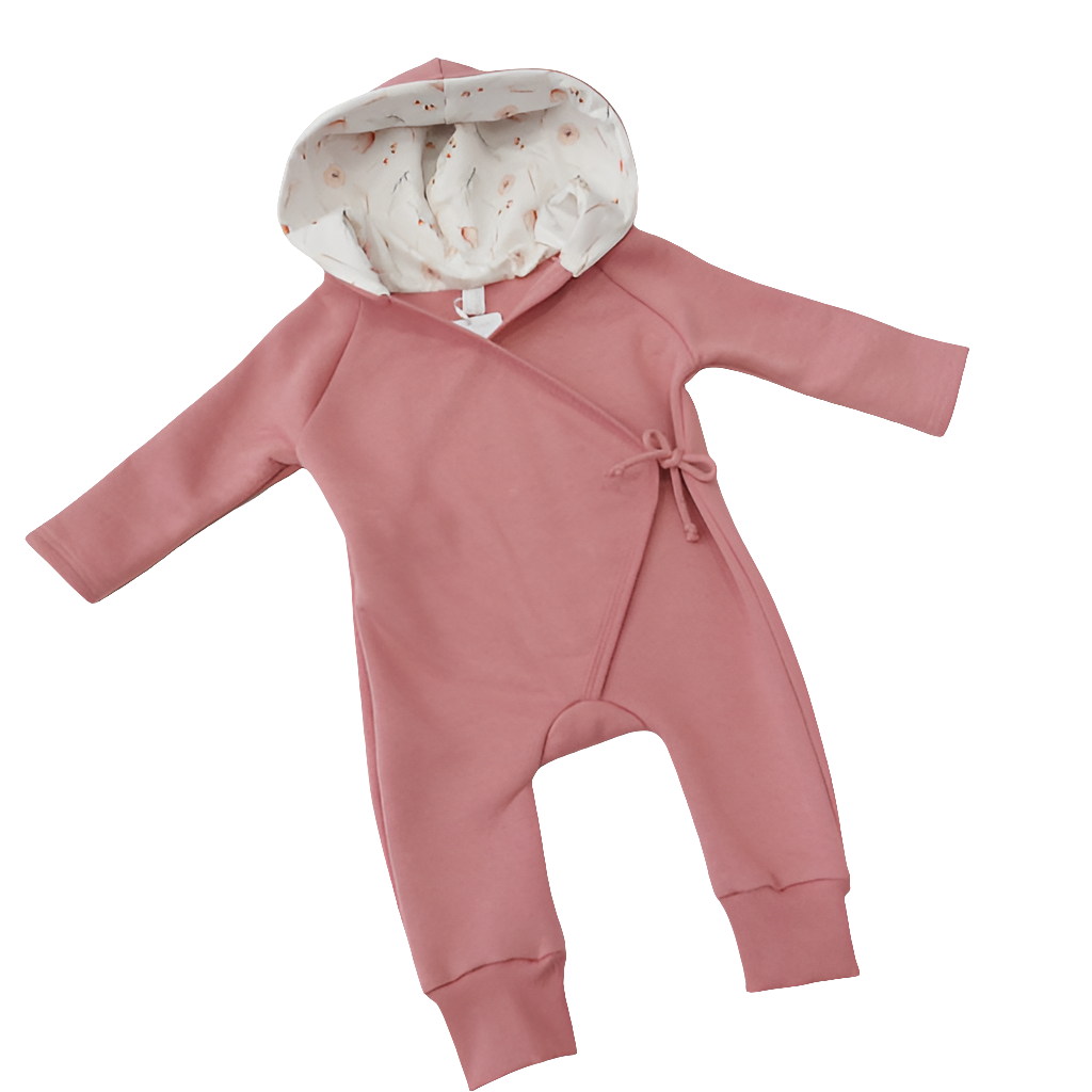 Ολόσωμο βρεφικό φορμάκι με κουκούλα και κρουαζέ άνοιγμα εμπρός.